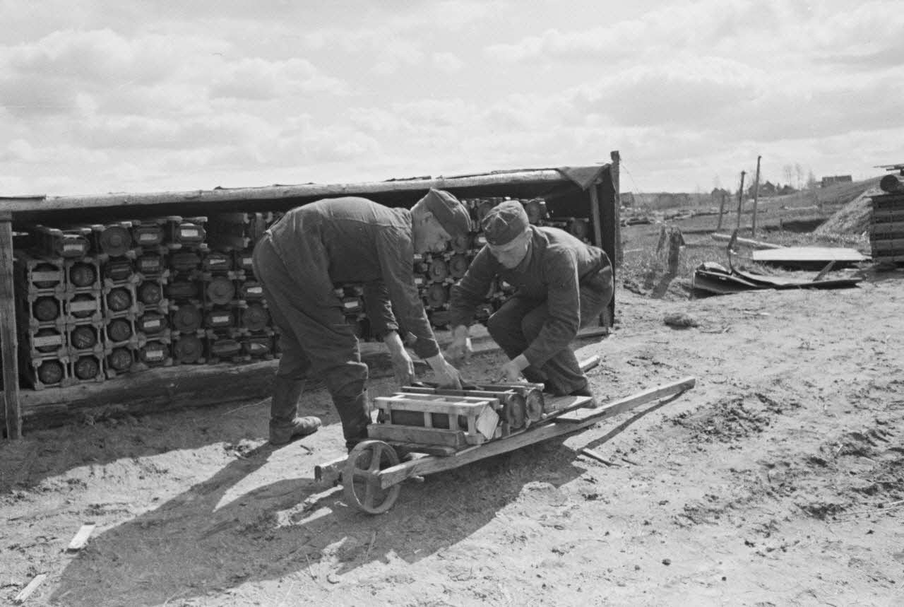 Les servants d'une pièce d'artillerie allemande de 10,5 cm FH 18 (Feldhaubitze) construisent une brouette pour le transport des munitions.