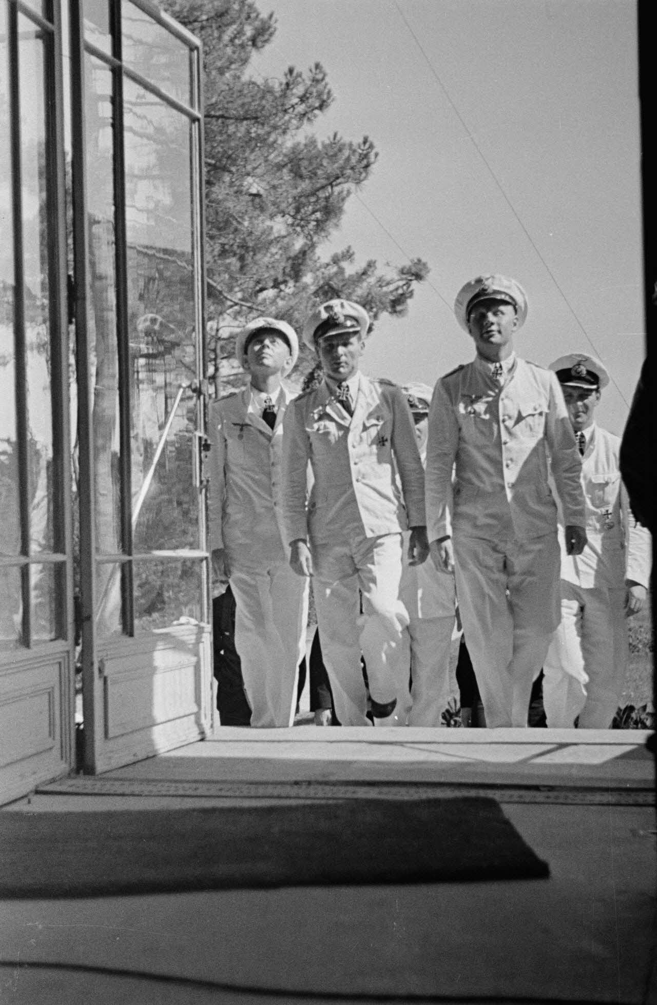 Les sous-mariniers Engelbert Endrass, Claus Korth, Heinrich Lehmann-Willenbrock, Erich Topp et Herbert Kuppisch entrent dans l'hôtel Royal de La Baule où a lieu une exposition de peintres de guerre.