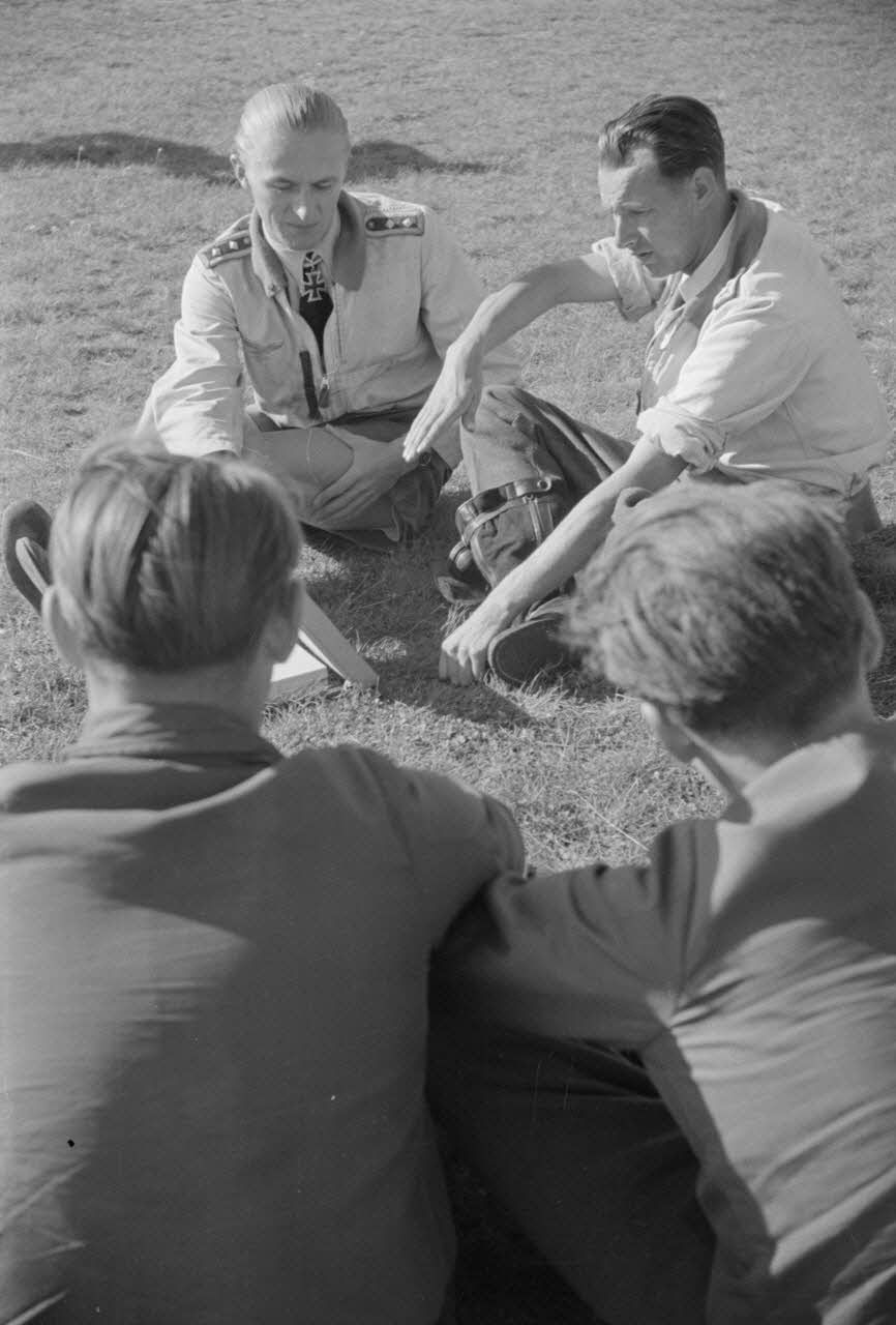 Georg Schentke et Eberhard von Boremski, récemment nommés instructeurs au sein de l'unité de formation, posent pour le reporter. Les mécaniciens de l'unité sont également à l'honneur, on remarque les chasseurs Messerschmitt Bf-109 F qui équipent l'unité. L'Oberfeldwebel prend place à bord d'un chasseur et entame la phase de décollage (DAA 2810 L22 à L26). Georg Schentke et Eberhard von Boremski évoquent un combat aérien, derrière eux et les élèves, les mécaniciens de l'unité effectuent la maintenance des appareils.