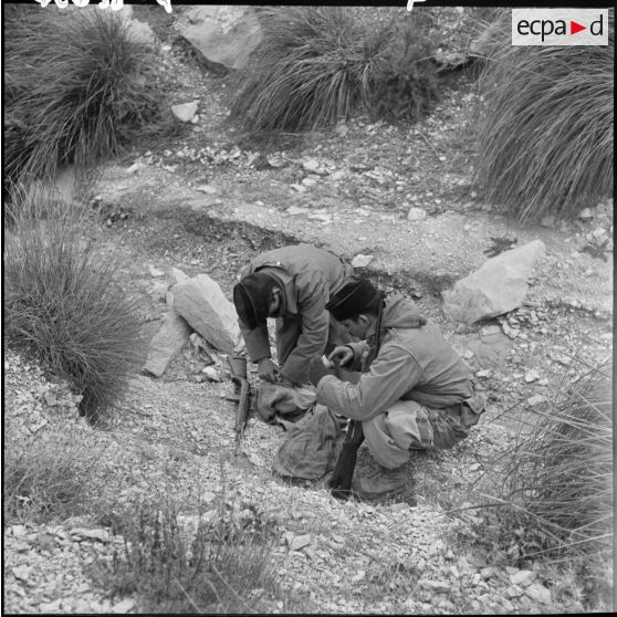Les hommes du 8e RPC découvrent deux fellaghas avec deux fusils de chasse dans une cachette lors de l'opération du 3 janvier 1958 à Tebessa.