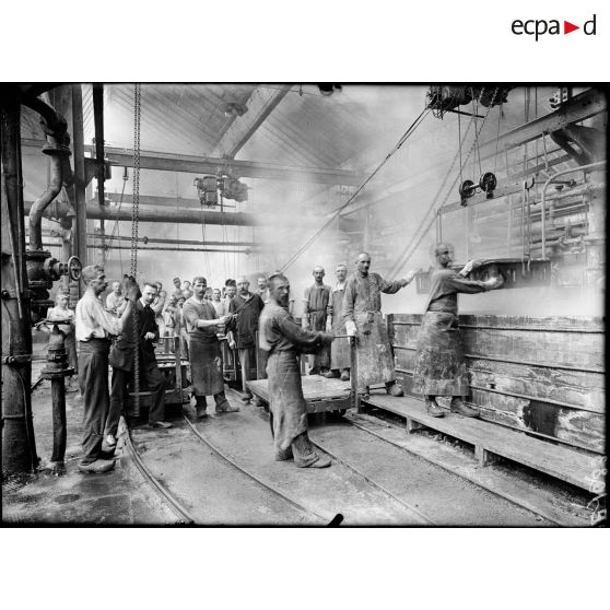 Lyon (Rhône). Usine Gillet Frères. Quai de Serin. Prisonniers allemands déchargeant des obus.