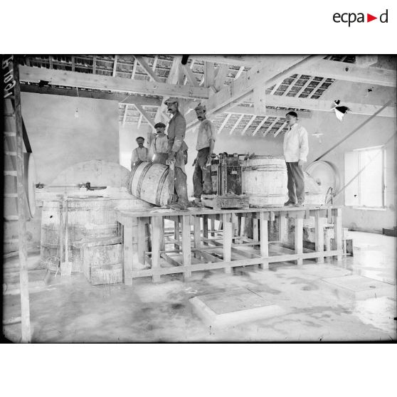 Sorgues-sur-l'Ouvèze (Vaucluse). Fabrique d'aquinite pour les gaz asphyxiants. Tonneaux de chlorure de chaux montés aux malaxeurs. Juin 1917.