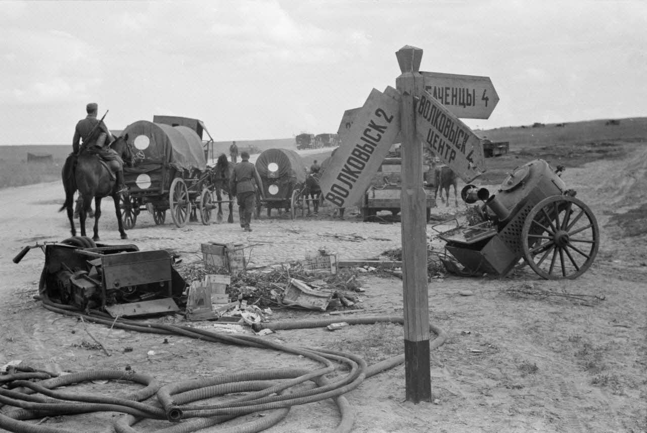 On note l'insigne de la 137. infanterie division sur les véhicules ainsi que les pavillons de reconnaissance pour l'aviation allemande (DAT 1691 L05A). Le contraste est saisissant entre les véhicules motorisés de l'armée Rouge, détruits ou abandonnés, avec les convois hippomobiles allemands.