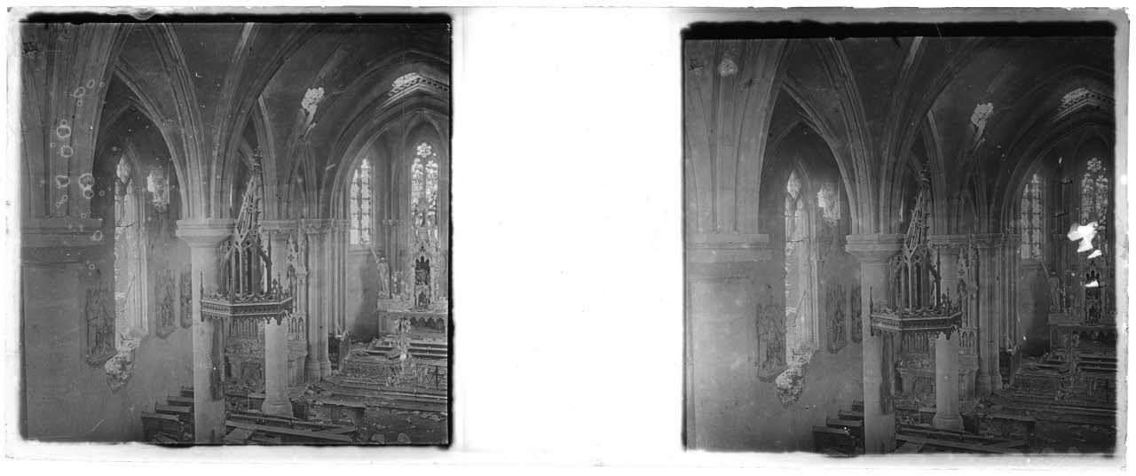 D169-1-116. [Autel dans un intérieur]. NB : la légende de cette photographie, inscrite sur l’espace entre les deux vues stéréoscopiques, est difficilement lisible.