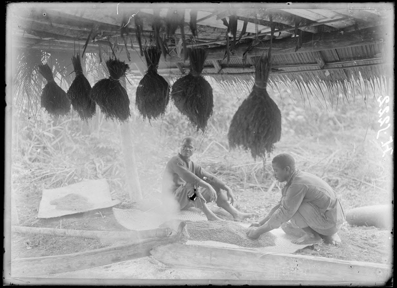 A Lolodorf, des hommes cultivent le riz (coupage, séchage, vannage, pilonnage des grains) au port, sur la rivière Lokundjé. Des arbres exotiques (goyavier, papayer, caféier) poussent sur les rives.