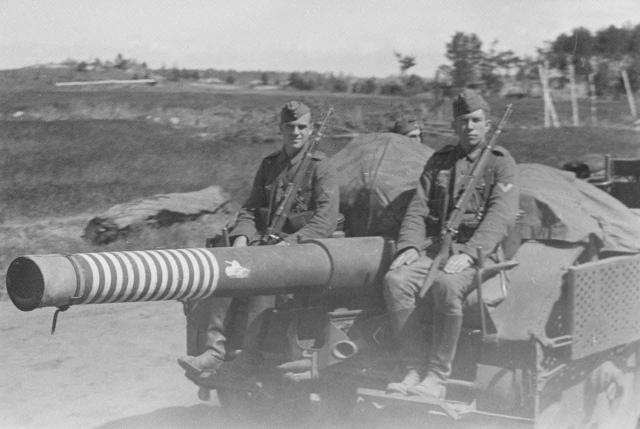 Une charrette hippomobile dotée de deux mitrailleuses MG-34 jumelées Maschinengewehrwagen 36 (If. 5), lors d'un défilé rythmé par le corps de musique du 83e régiment d'artillerie (évoluant au sein de la 83e division d'infanterie).
