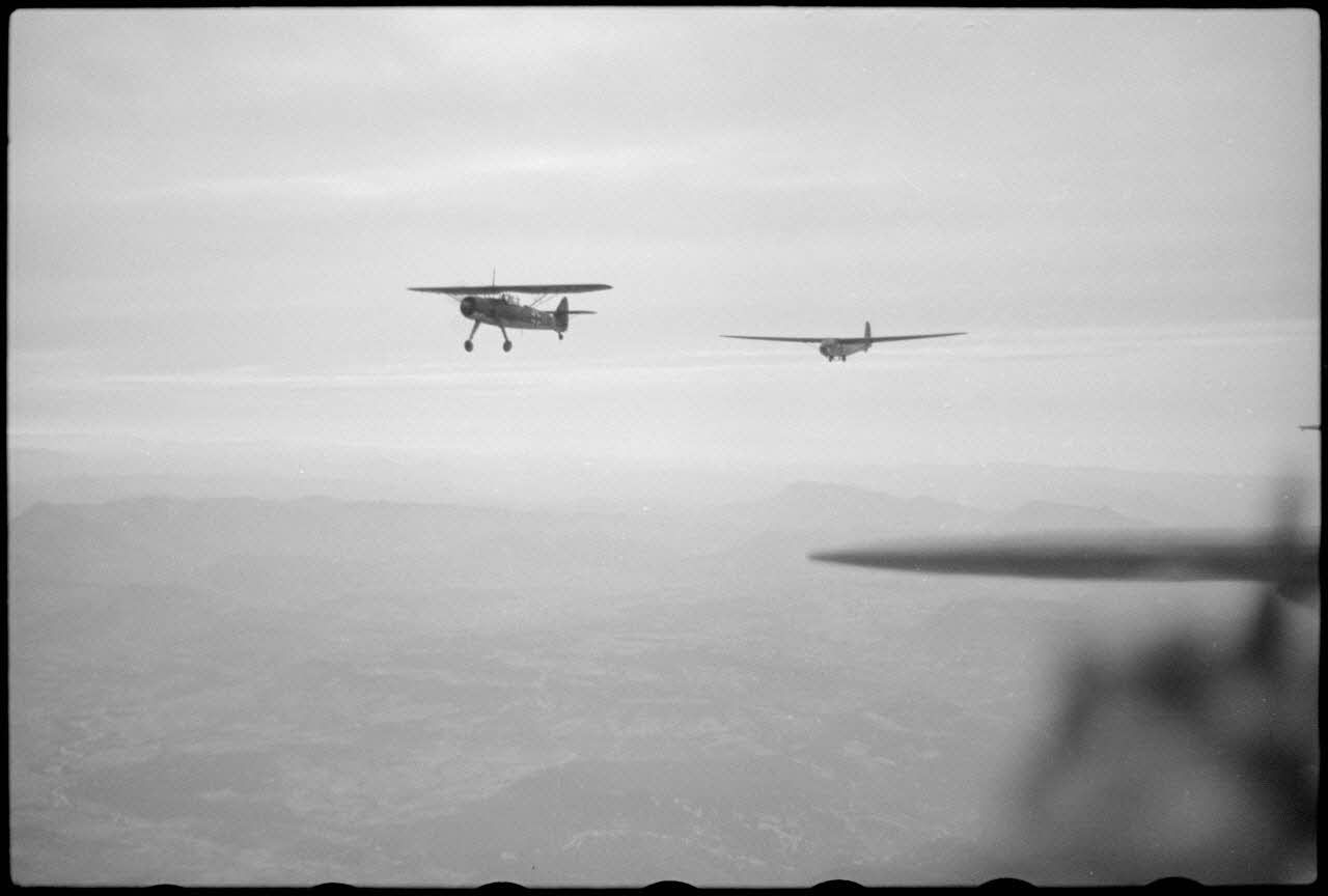 Au dessus de la Drôme, lors d'un exercice aéroporté, un Henschel Hs-126 utilisé comme remorqueur au sein du Luftlandegeschwader 1.