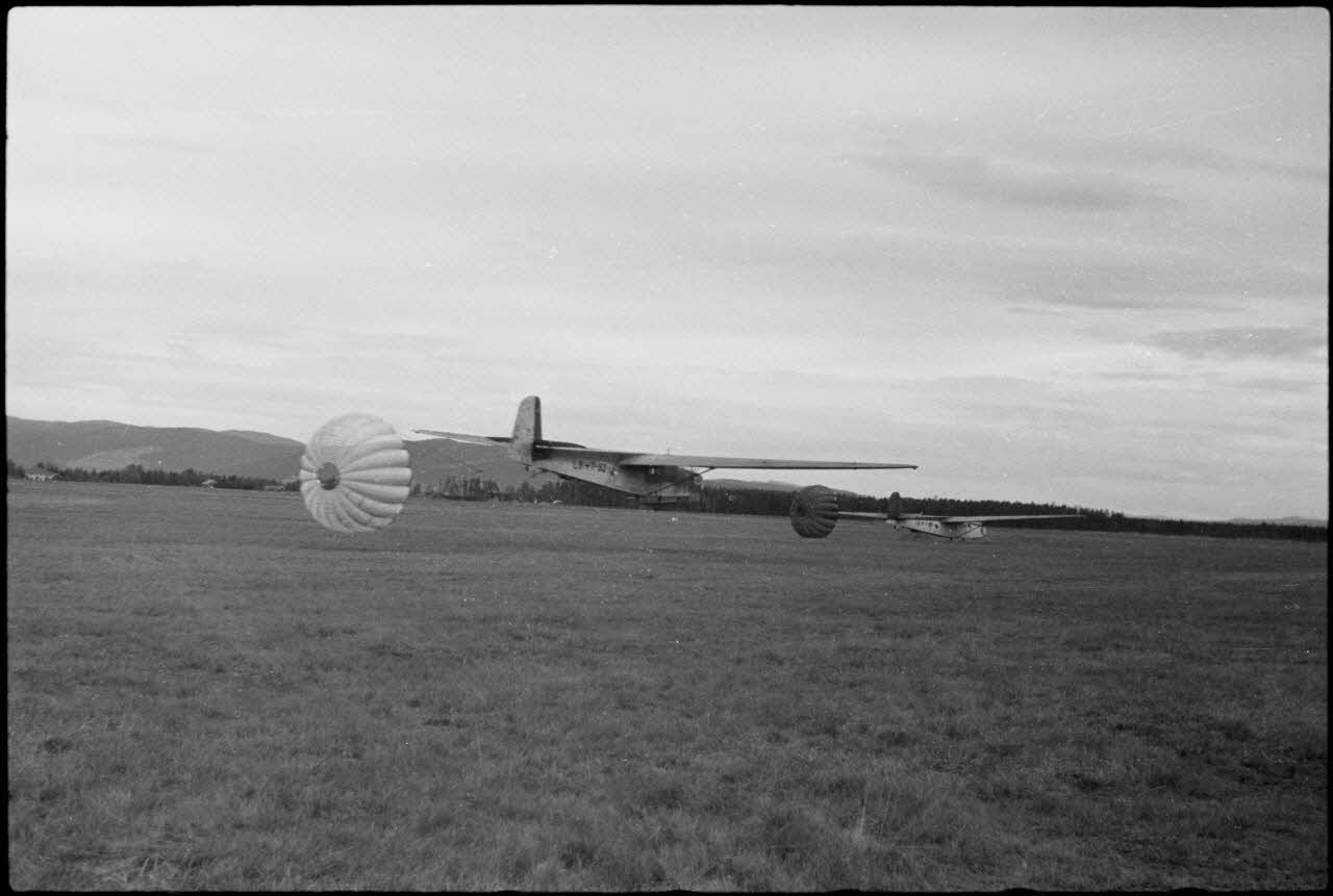 Lors d'une démonstration aéroportée sur le terrain d'aviation de Banak (Norvège), un planeur DFS-230 du Luftlandegeschwader 1 (8./LLG 1) amorce sa descente, il est freiné par un parachute.