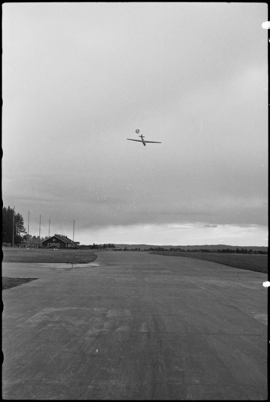 Lors d'une démonstration aéroportée sur le terrain d'aviation de Banak (Norvège), un planeur DFS-230 du Luftlandegeschwader 1 (8./LLG 1) amorce sa descente, il est freiné par un parachute.