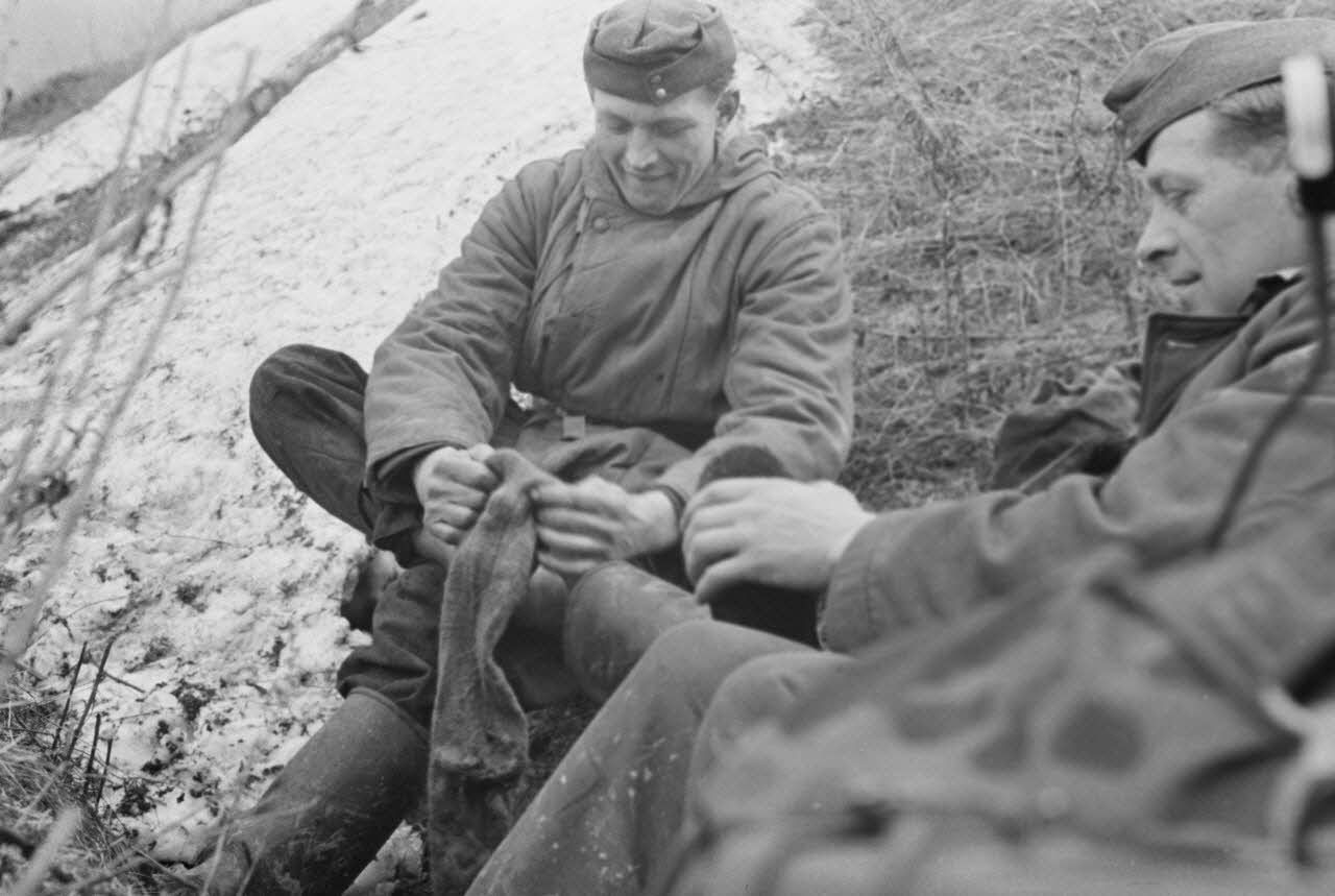 Lors d'une patrouille, des fantassins allemands qui viennent de traverser une rivière doivent changer de chaussettes.