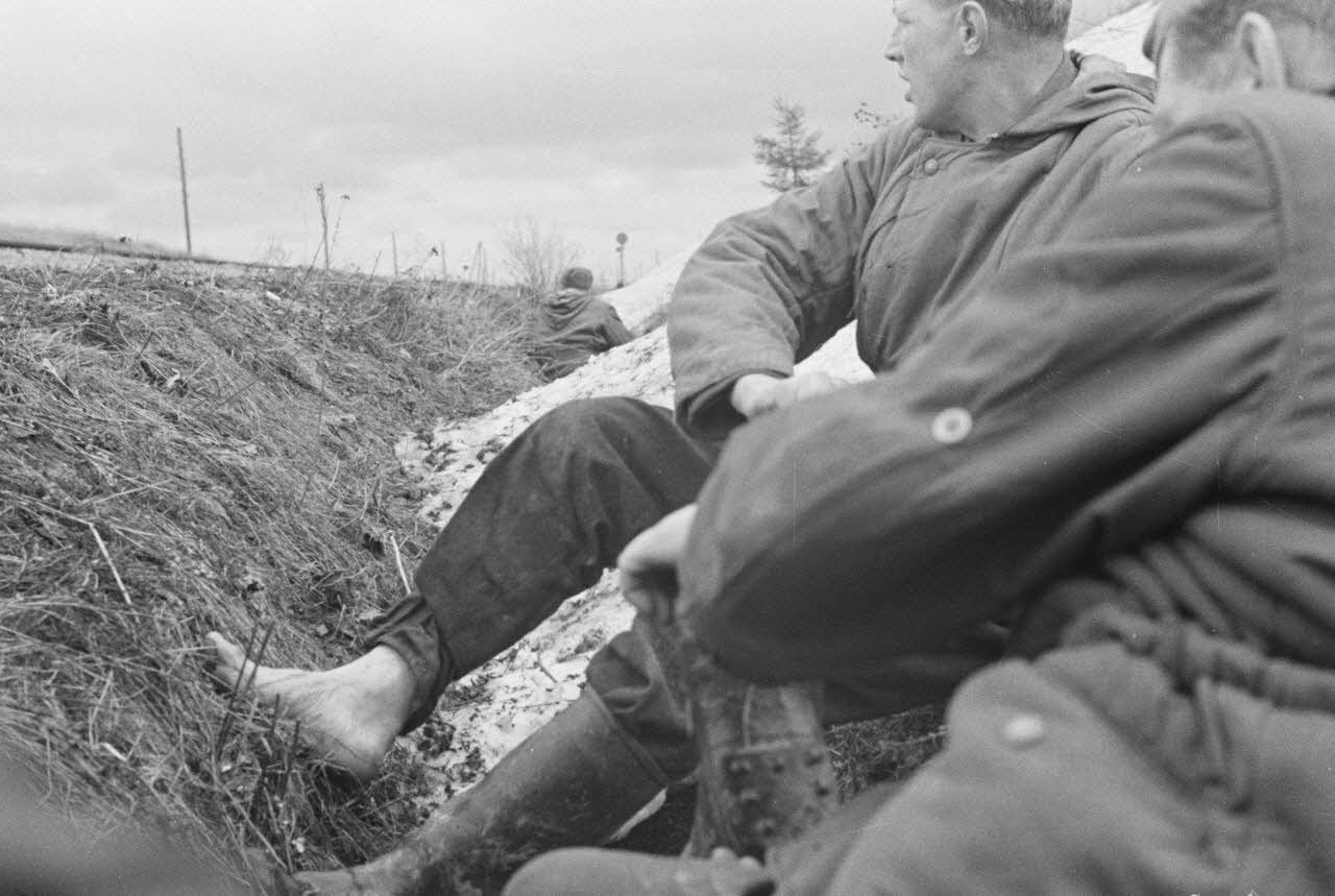 Lors d'une patrouille, des fantassins allemands qui viennent de traverser une rivière doivent changer de chaussettes.