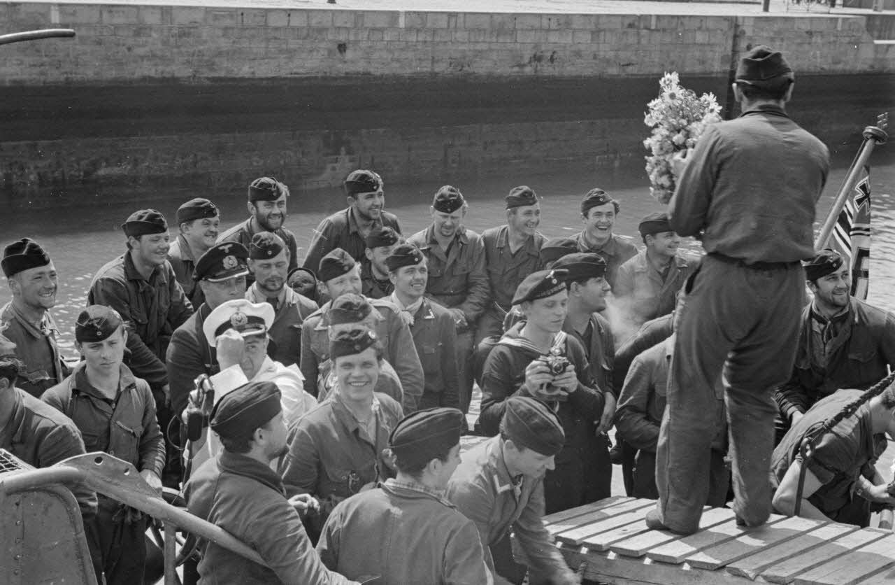 Dans le port de Saint-Nazaire, l'accueil réservé au commandant du sous-marin U-203, le Kapitänleutnant Rolf Mützelburg.