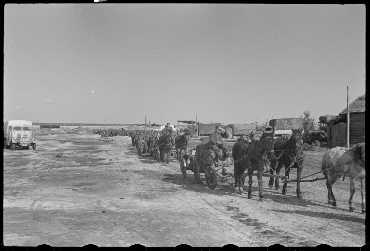 Un convoi hippomobile composé de fantassins allemands et de civils russes marque une pause après la traversée d'un pont.