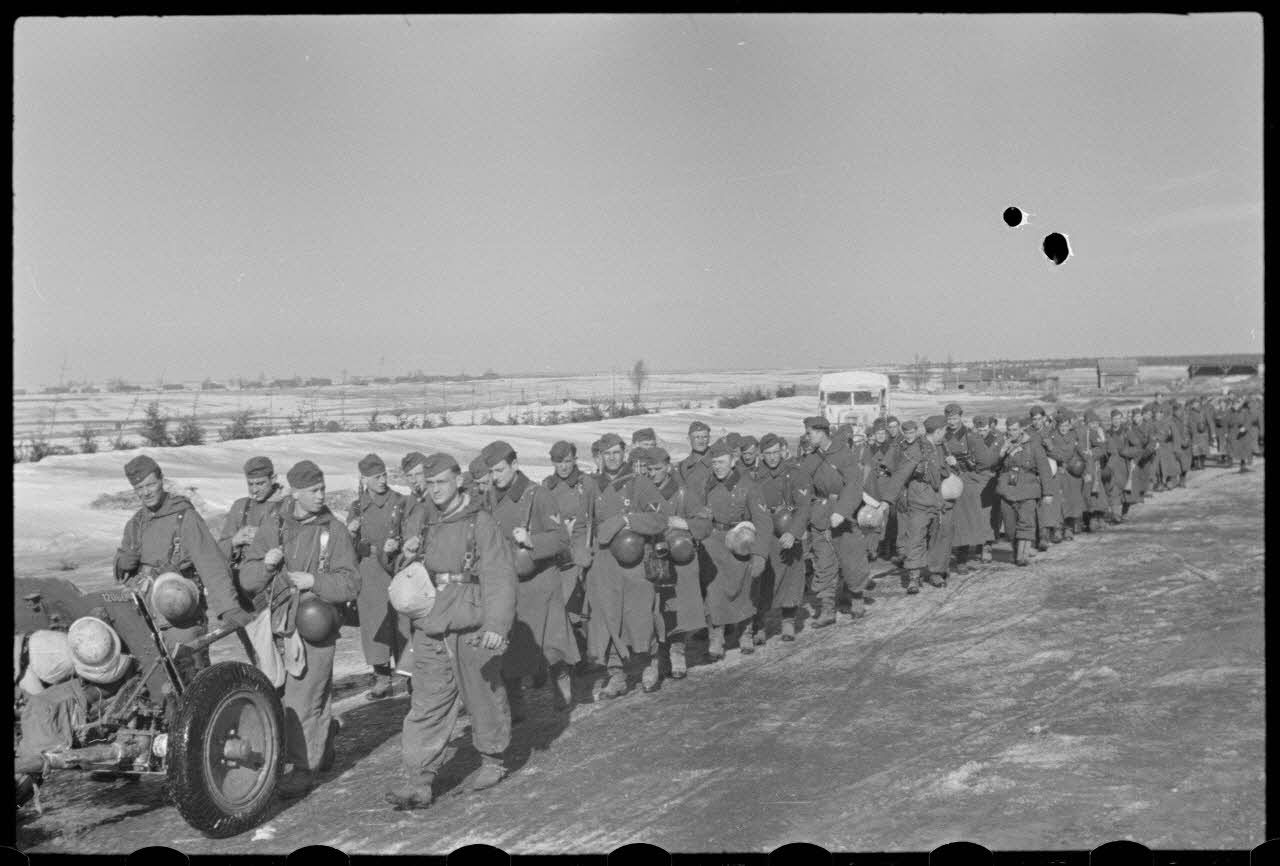 Lors de l'opération Büffelbewegung, la retraite de fantassins allemands sur la route Wjasma-Smolensk.
