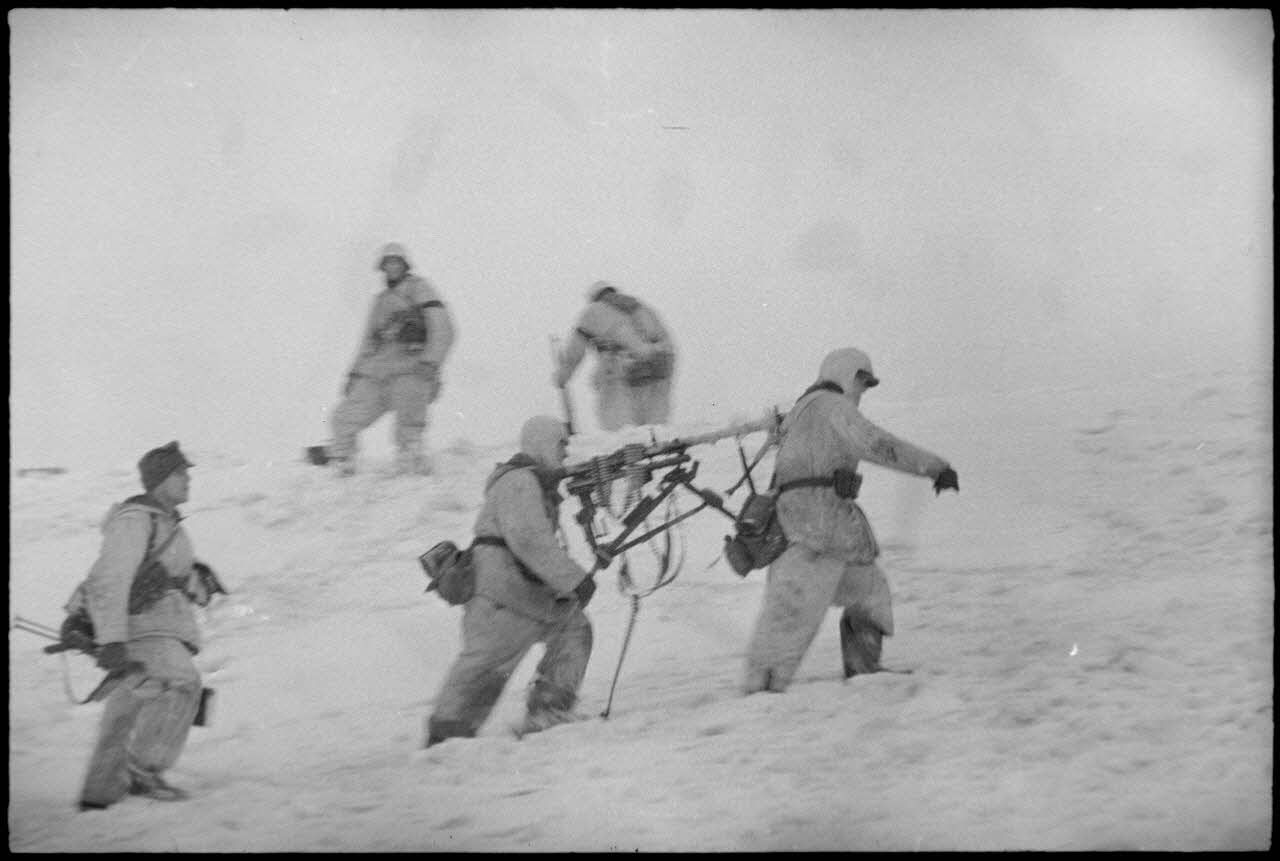 Lors de la bataille de Witebsk, des fantassins allemands mettent en batterie une mitrailleuse MG-34 sur affût lourd pour tenter de retenir les assauts soviétiques.
