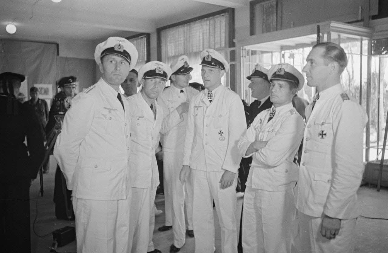 Les commandants de sous-marins Engelbert Endrass, Claus Korth, Heinrich Lehmann-Willenbrock, Erich Topp et Herbert Kuppisch visitent une exposition de dessins et de peintures à hôtel Royal de La Baule.