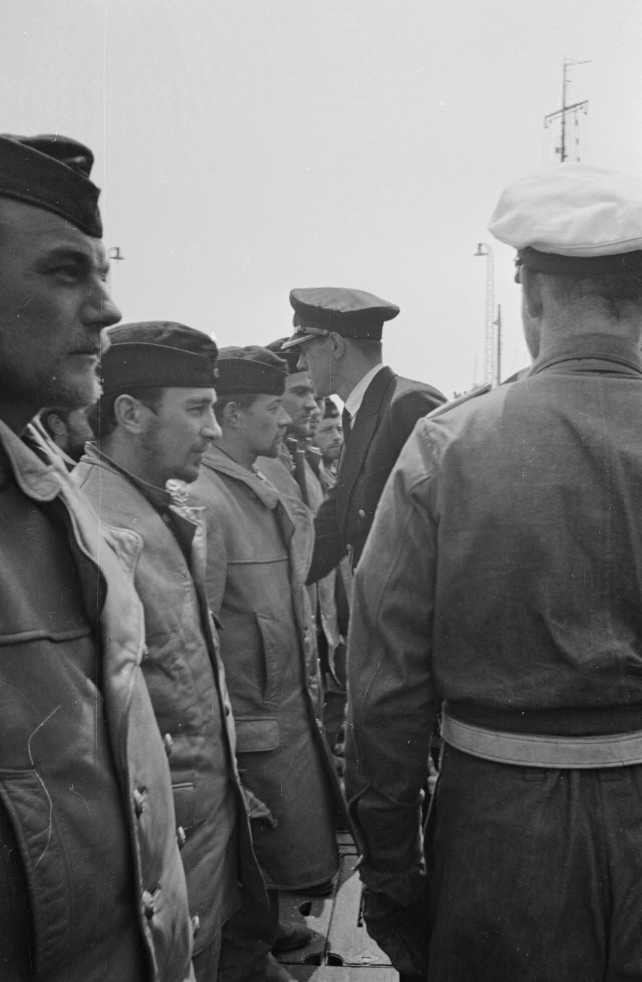 A Saint-Nazaire, depuis le pont du sous-marin U-552 du lieutenant (Leutnant zur See) Erich Topp, le photographe Kurt Schlemmer immortalise les officiers venus accueillir le sous-marin et son équipage.