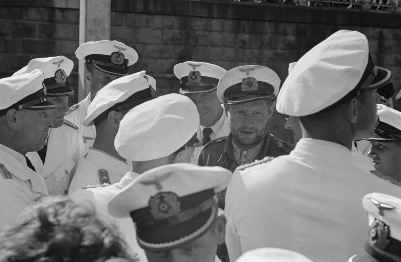 Lors du retour du sous-marin U-96 au port de Saint-Nazaire, le capitaine (kapitänleutnant) Herbert Sohler, représentant de la 7.Unterseebootsflottille, passe en revue l'équipage en présence du capitaine (Kapitänleutnant) Lehmann Villenbrook.