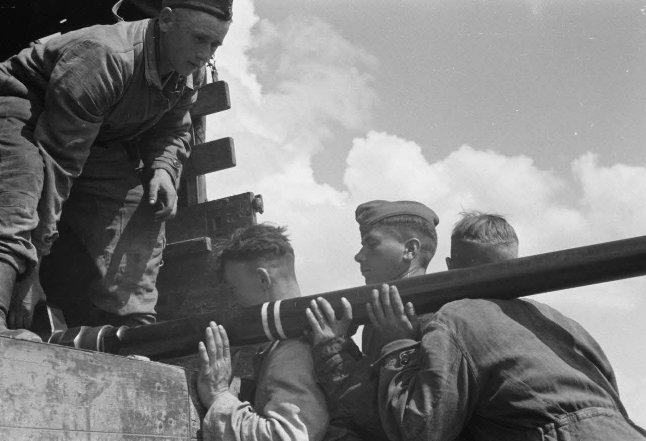 Artilleurs de la Flak lors des préparatifs de déplacement d'une batterie.
