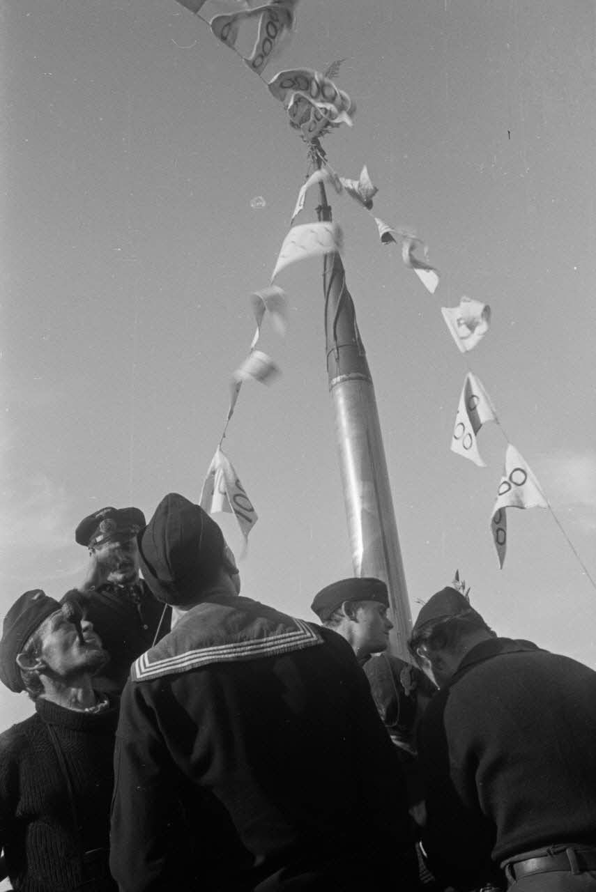 Lors du retour de la 8e mission en mer, l'équipage du sous-marin allemand U-Boot U-553 (commandé par Karl Thurmann) fixe les fanions sur lesquels sont indiqués le tonnage des bâtiments coulés.