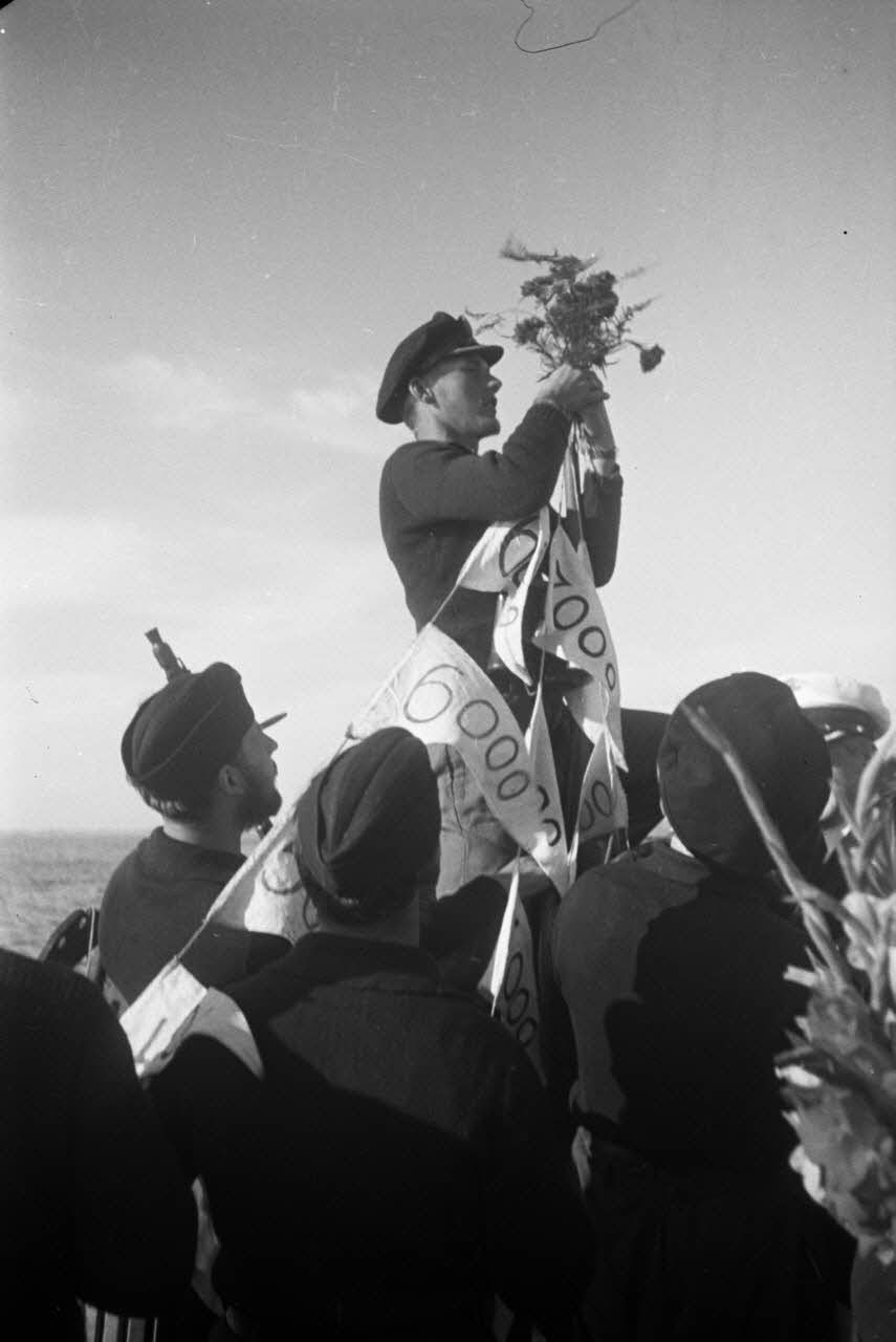 Lors du retour de la 8e mission en mer, l'équipage du sous-marin allemand U-Boot U-553 (commandé par Karl Thurmann) fixe les fanions sur lesquels sont indiqués le tonnage des bâtiments coulés.