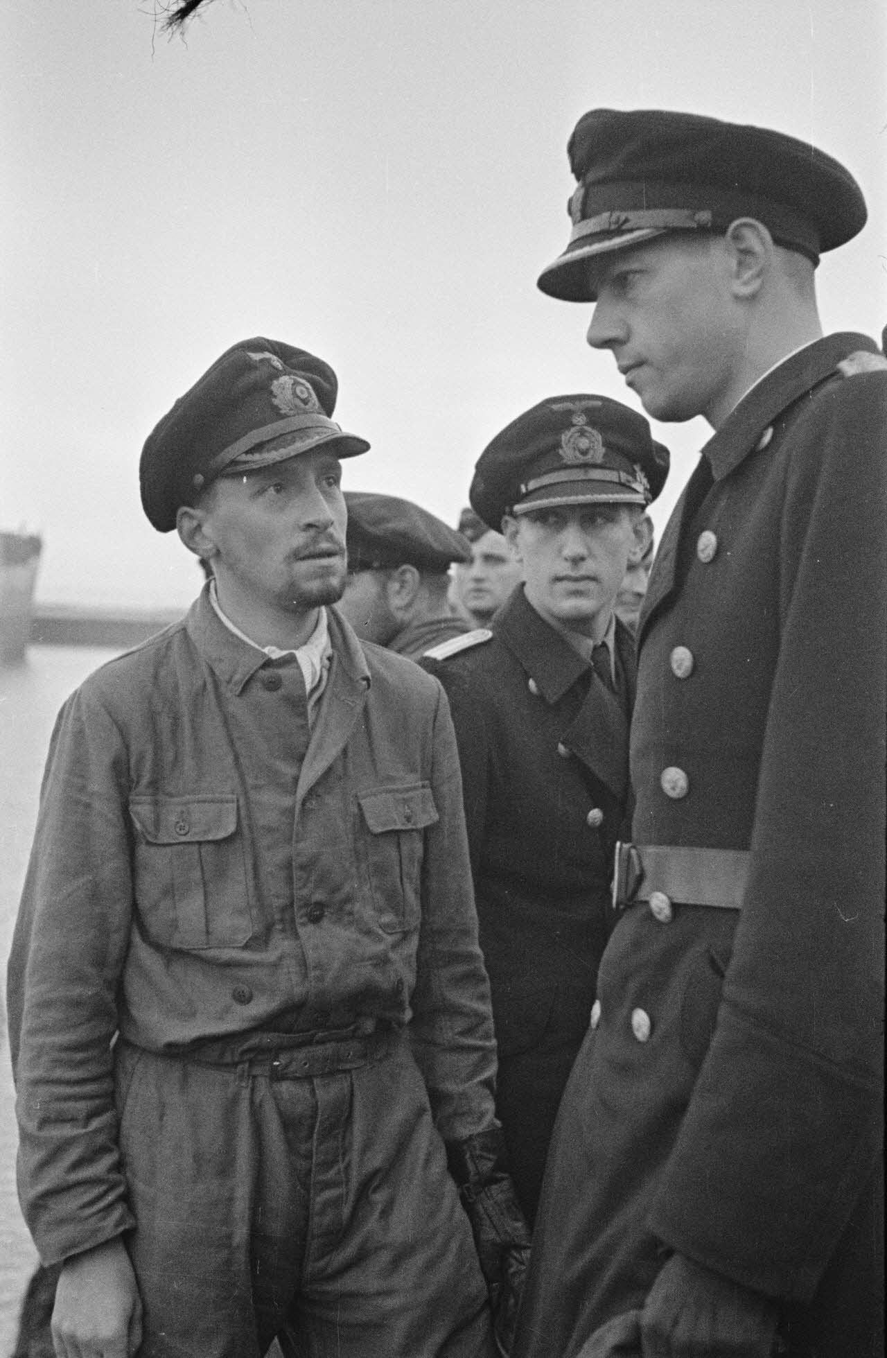 De retour au port de Saint-Nazaire, le lieutenant (Oberleutnant zur See) Horst Elfe commandant du sous-marin U-93 rencontre des officiers de la marine venus l'accueillir.
