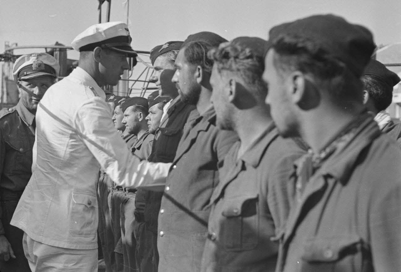 Lors du retour du sous-marin U-96 au port de Saint-Nazaire, le capitaine (kapitänleutnant) Herbert Sohler, représentant de la 7.Unterseebootsflottille, passe en revue l'équipage en présence du capitaine (Kapitänleutnant) Lehmann Villenbrook.