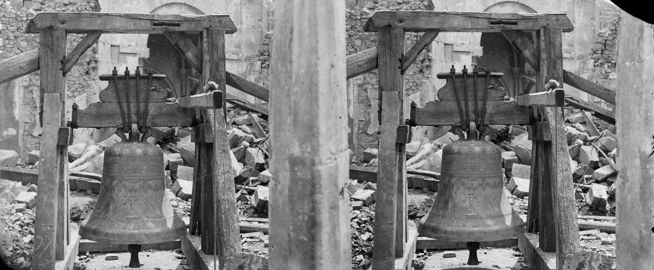 Louppy-le-Château. Façade de l’église, au premier plan cloche installée provisoirement sur le sol. [légende d’origine]
