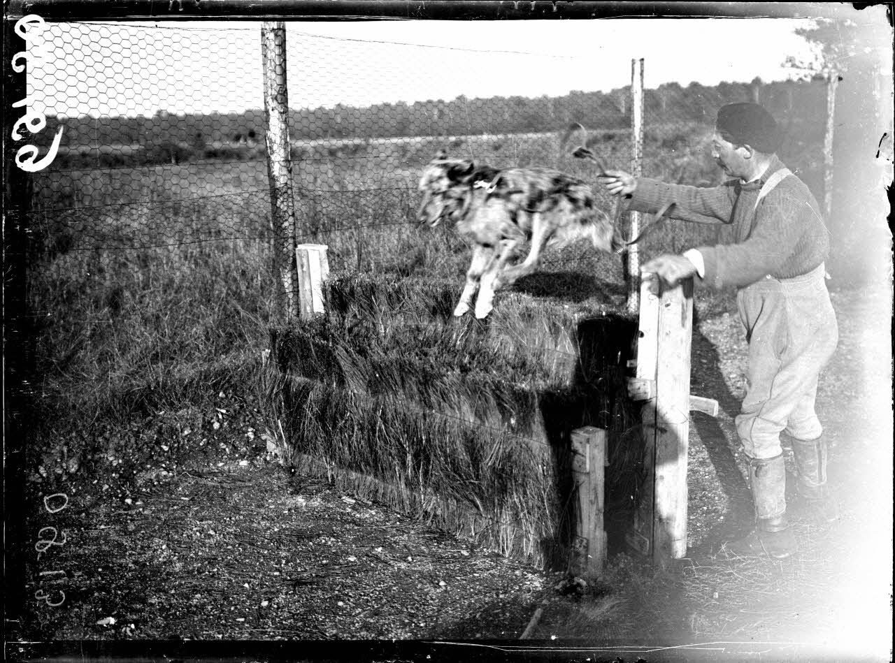 Lure (Haute-Saône). Le chenil de la VIIe armée. Dressage pour le passage d'un obstacle. [légende d'origine]