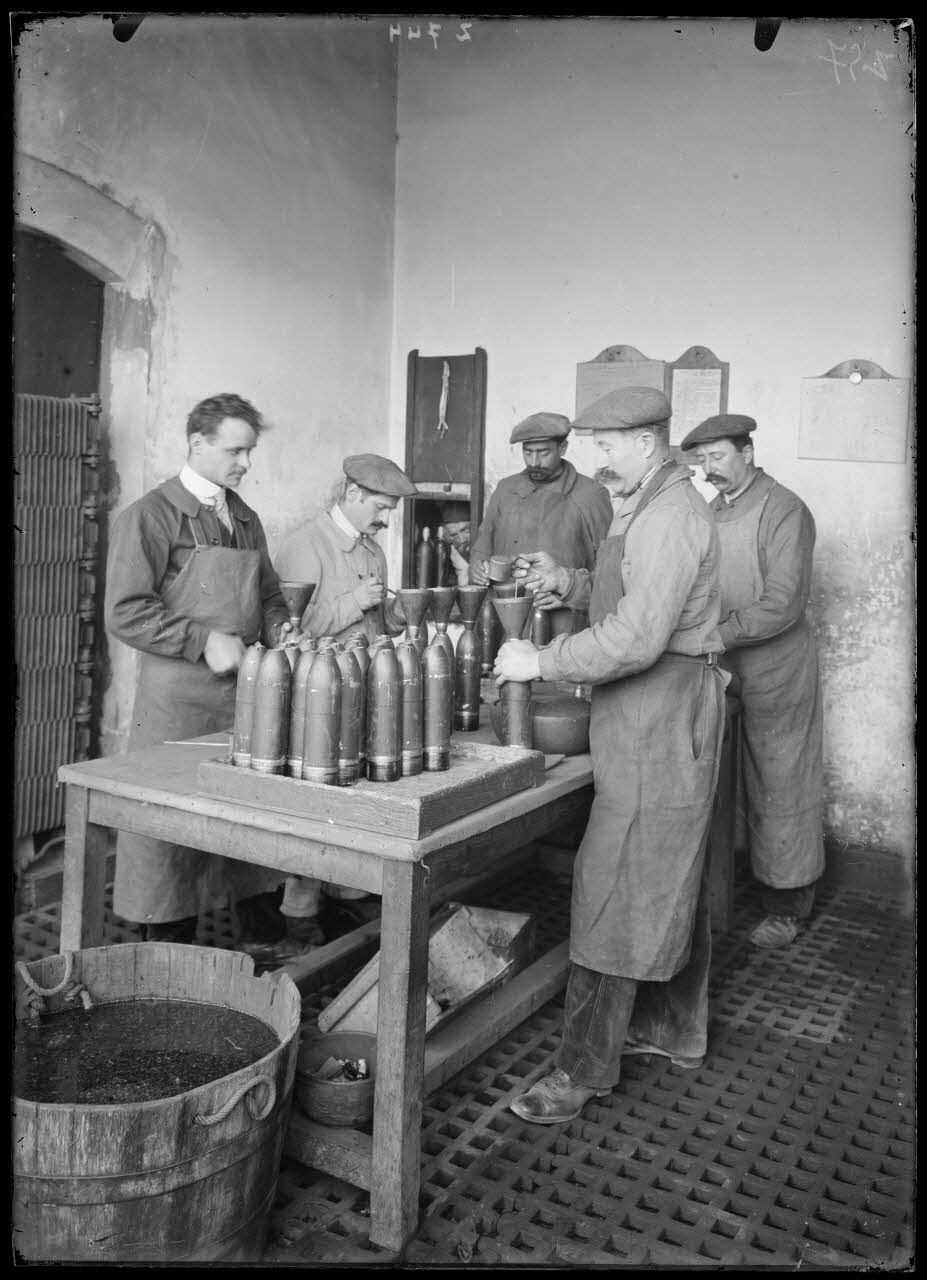 A l'arsenal de la Mouche (18/10/1915, Z 742 à Z 761) les ouvriers confectionnent les obus de 75 mm. (20/10/1915, Z 778 à Z 793) Les obus de 75 mm sont remplis et conditionnés en caisses.