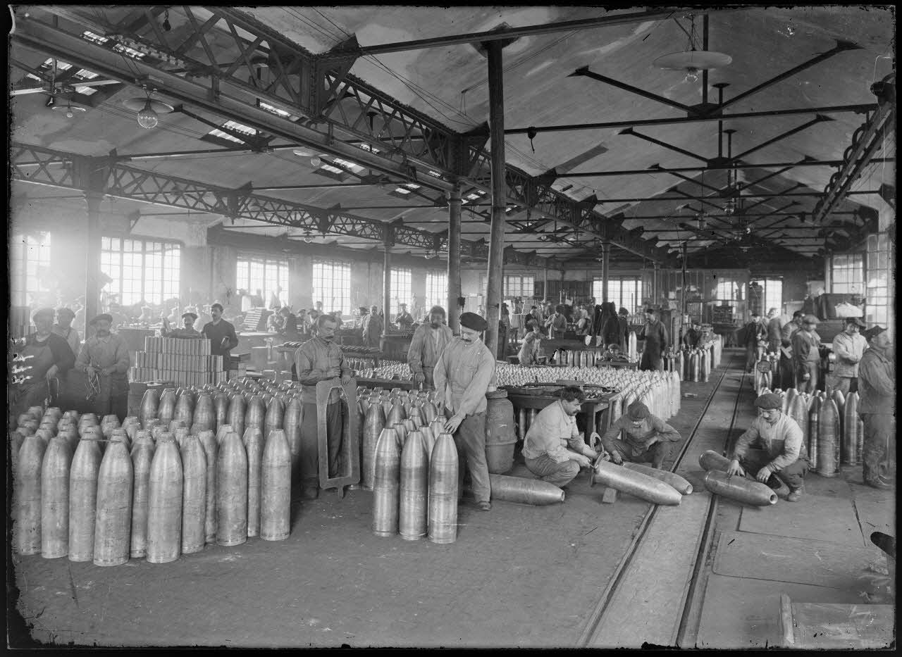 A l'arsenal de la Mouche (18/10/1915, Z 742 à Z 761) les ouvriers confectionnent les obus de 75 mm. (20/10/1915, Z 778 à Z 793) Les obus de 75 mm sont remplis et conditionnés en caisses.