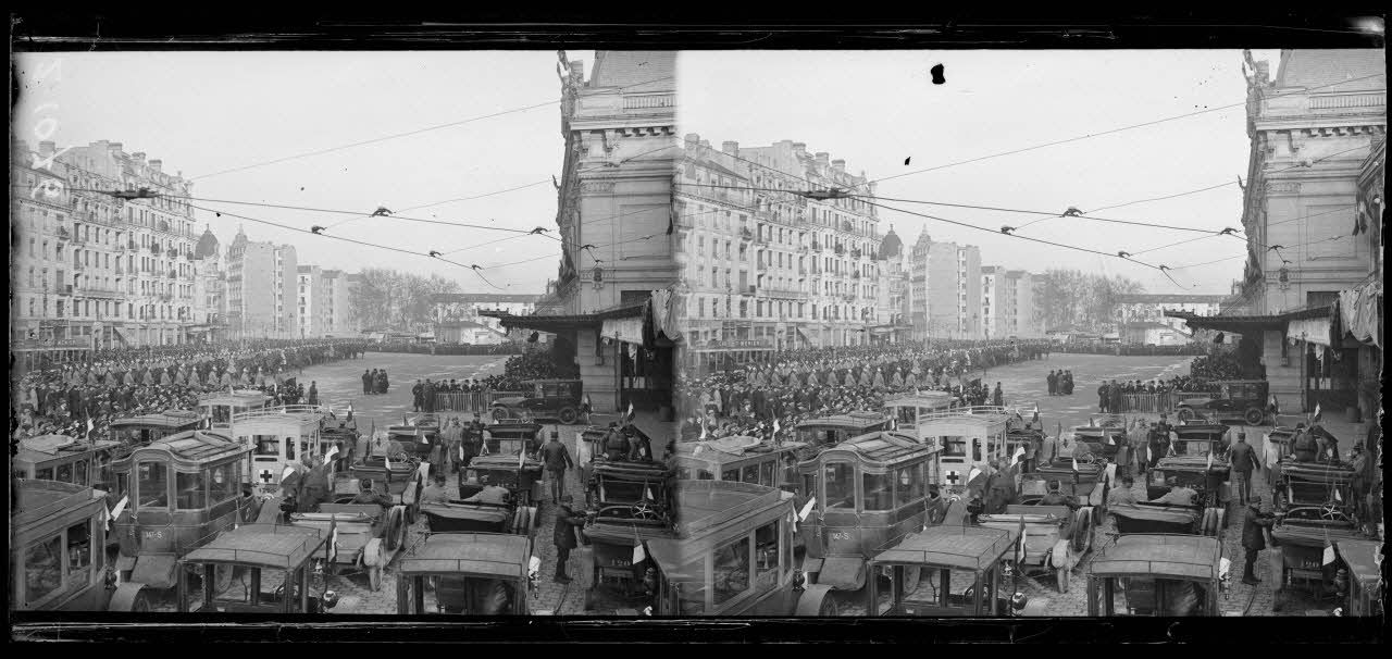 Lyon. Devant la gare de Lyon Brotteaux, automobiles attendant l’arrivée des blessés.