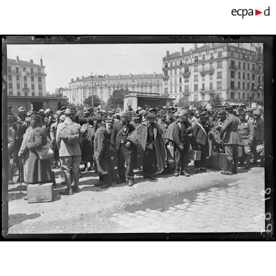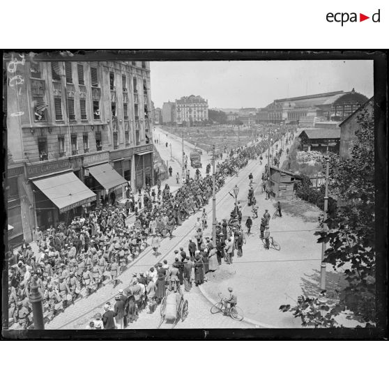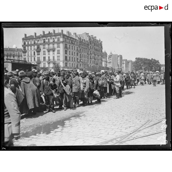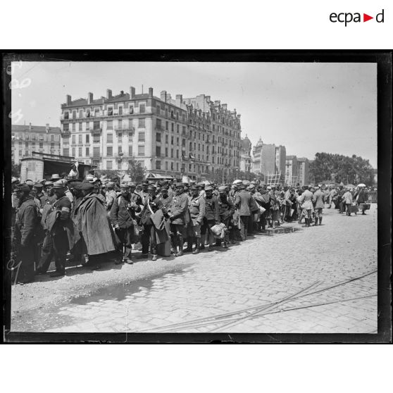 Portraits de soldats français et de prisonniers de guerre. Défilé de soldats sur le cours Lafayette à Lyon.