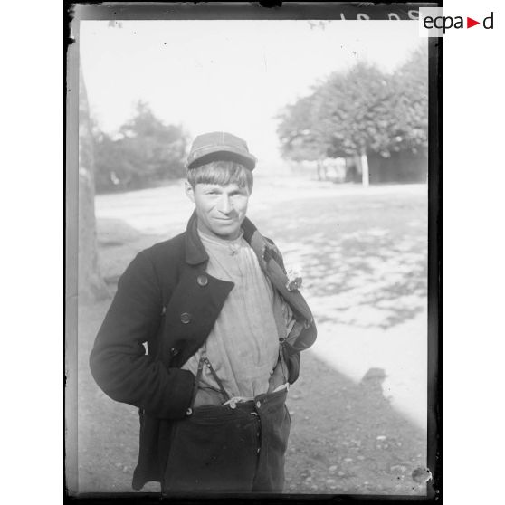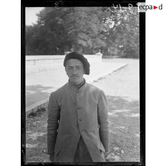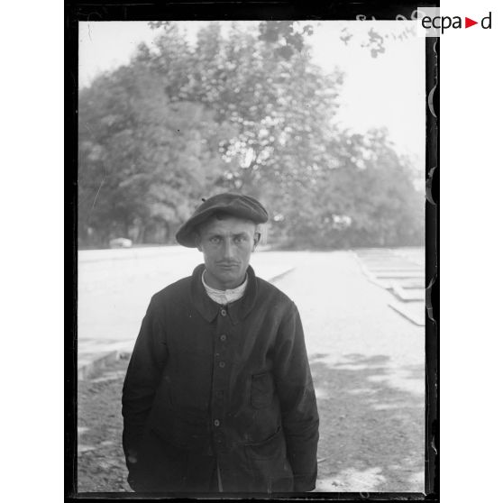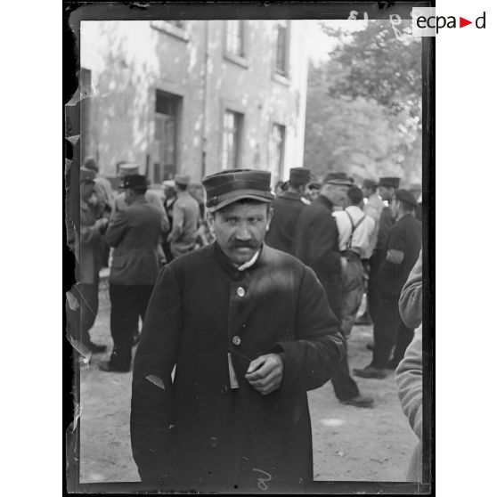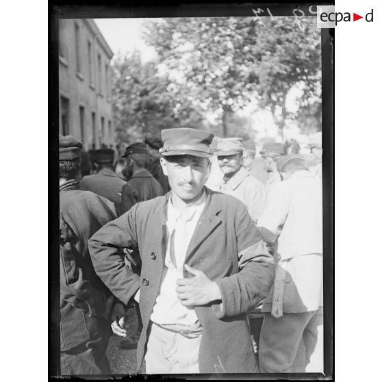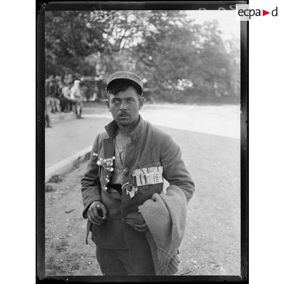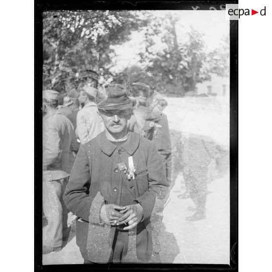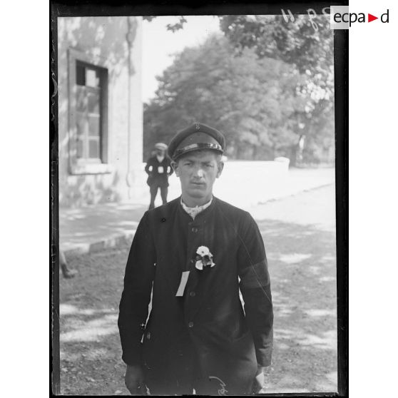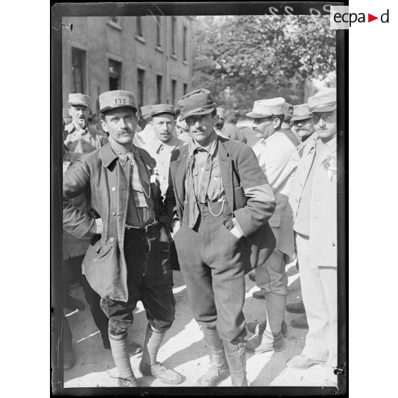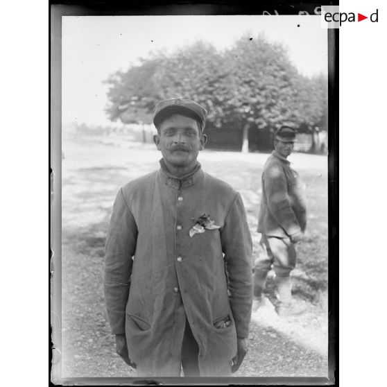Portraits de soldats français portant une fleur à la boutonnière, dans la cour d'un bâtiment.