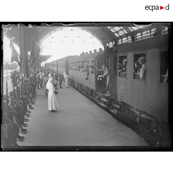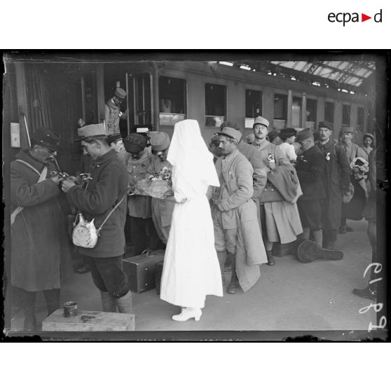 Départ ou arrivée de soldats dans une gare.