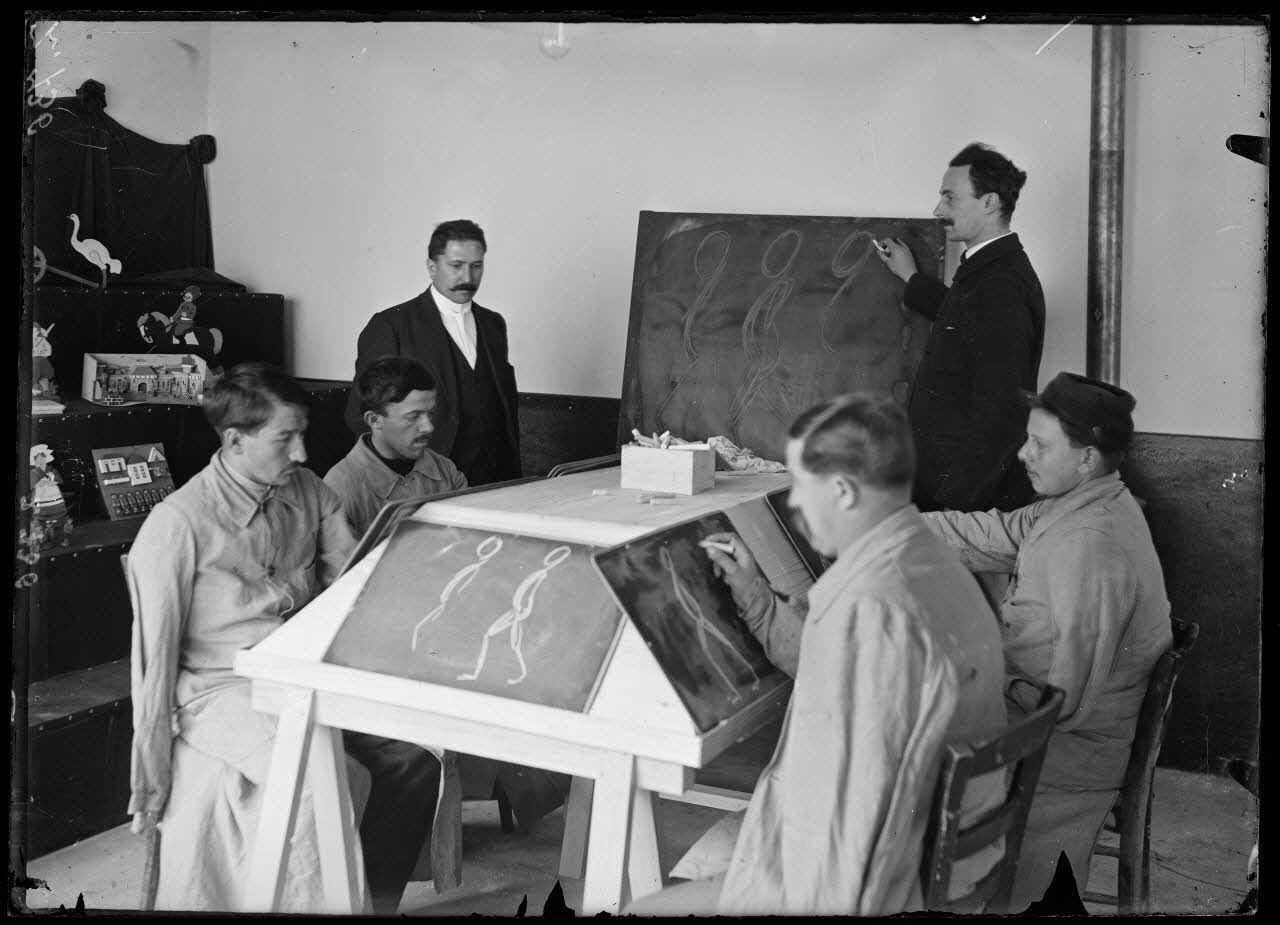 A l'école Joffre professionnelle pour blessés (16/10/1915, Z 728 à Z 736), les blessés fabriquent des jouets en bois.