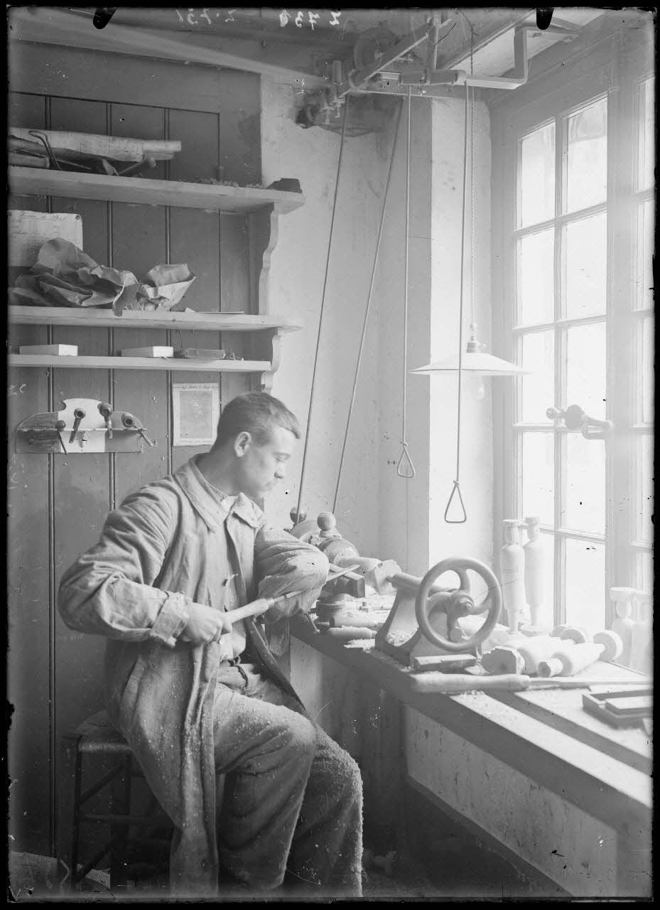A l'école Joffre professionnelle pour blessés (16/10/1915, Z 728 à Z 736), les blessés fabriquent des jouets en bois.