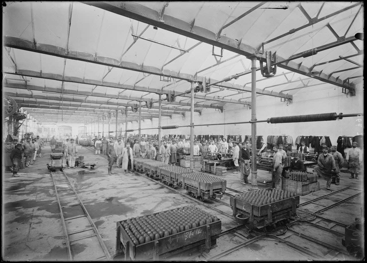 A l'arsenal de la Mouche (18/10/1915, Z 742 à Z 761) les ouvriers confectionnent les obus de 75 mm. (20/10/1915, Z 778 à Z 793) Les obus de 75 mm sont remplis et conditionnés en caisses.