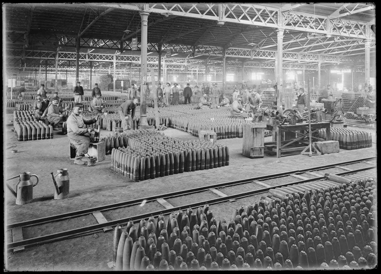 A l'arsenal de la Mouche (18/10/1915, Z 742 à Z 761) les ouvriers confectionnent les obus de 75 mm. (20/10/1915, Z 778 à Z 793) Les obus de 75 mm sont remplis et conditionnés en caisses.