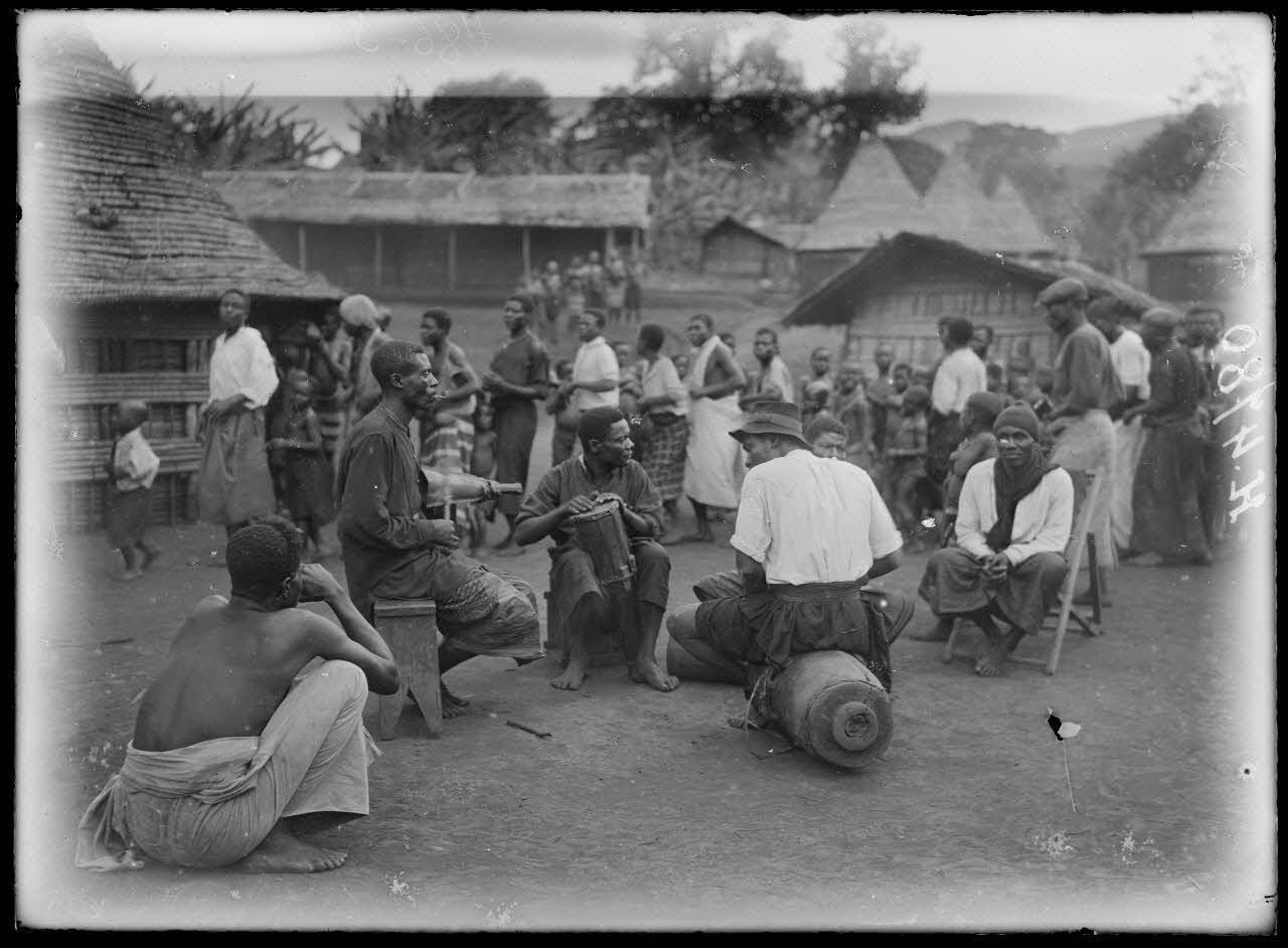 Les hommes du village d'N'Buréku effectuent des danses traditionnelles au son de divers instruments. Des femmes et des enfants de type M'Bo regardent le spectacle.