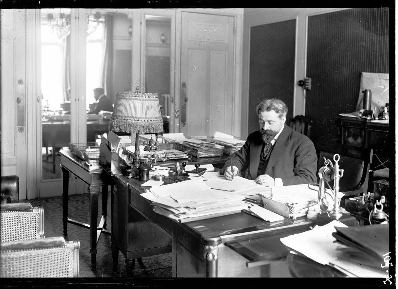 Portrait de Mario Roch, sous-chef du cabinet du sous-secrétariat d'Etat des munitions, derrière son bureau.