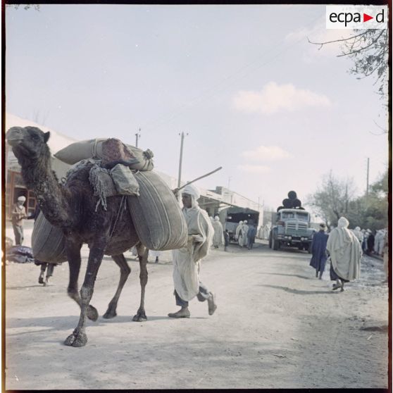 M'Sila. Souks hebdomadaires. Un marchand avec son chameau portant ses marchandises.