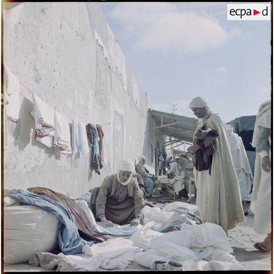 M'Sila. Souks hebdomadaires. Un marchand vend des tissus.