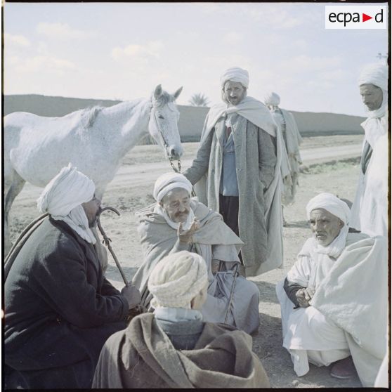 M'Sila. Souks hebdomadaires. Des hommes s'entretiennent.