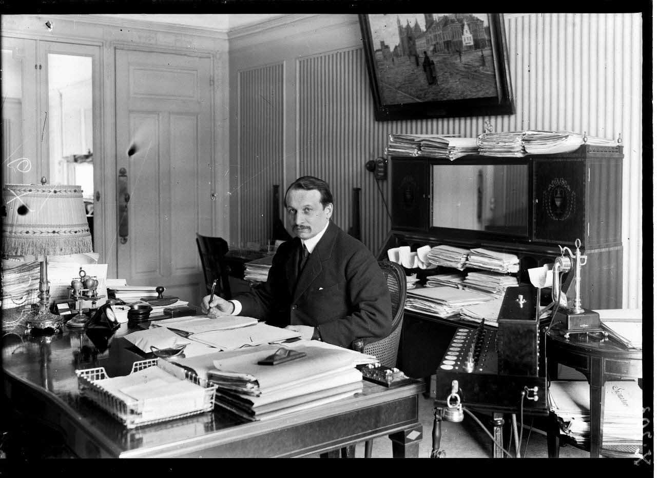 Portrait de monsieur Simyan, chef du cabinet du sous-secrétariat d'état des munitions, derrière son bureau.