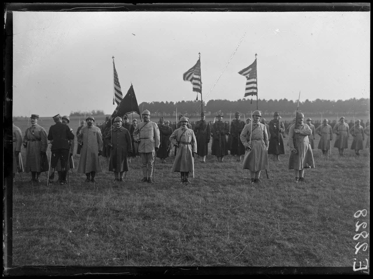 Mailly. Aube. Sur le champ d'aviation. Le général commandant l'artillerie de la 4eme armée passe en revue des unités américaines et françaises d'artillerie lourde. Le salut au drapeau.