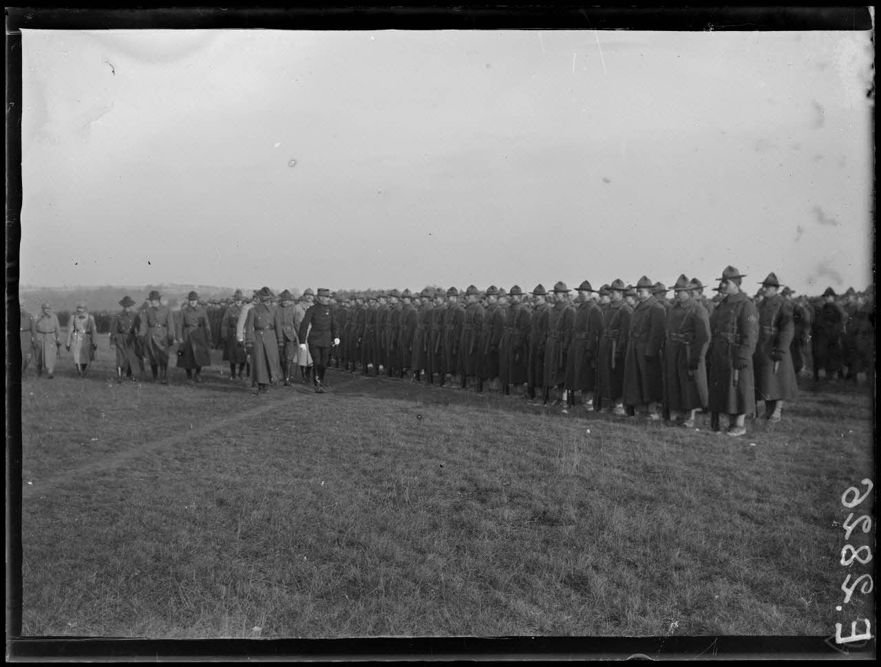 Mailly. Aube. Sur le champ d'aviation. Le général passant en revue les unités américaines. [légende d'origine]