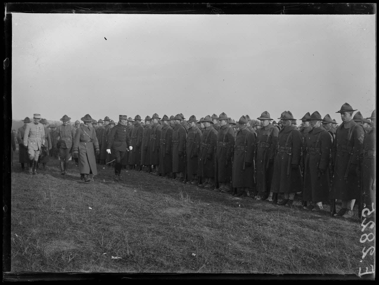 Mailly. Aube. Sur le champ d'aviation. Le général passant en revue les unités américaines. [légende d'origine]