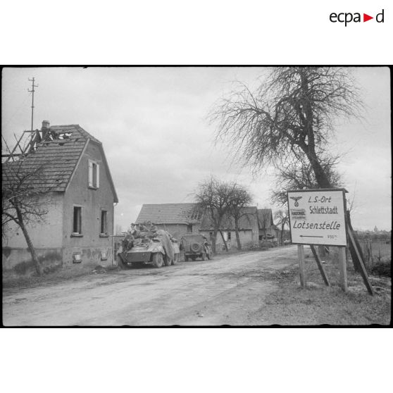Une automitrailleuse M8 du 1er régiment de marche de spahis marocains (1er RMSM) de la 2e division blindée (2e DB) stationne dans les environs de Sélestat (Bas-Rhin).