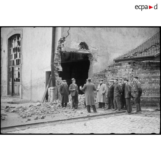 Dirigeants d'une filature à Sélestat (Bas-Rhin) devant leur entreprise en ruine.